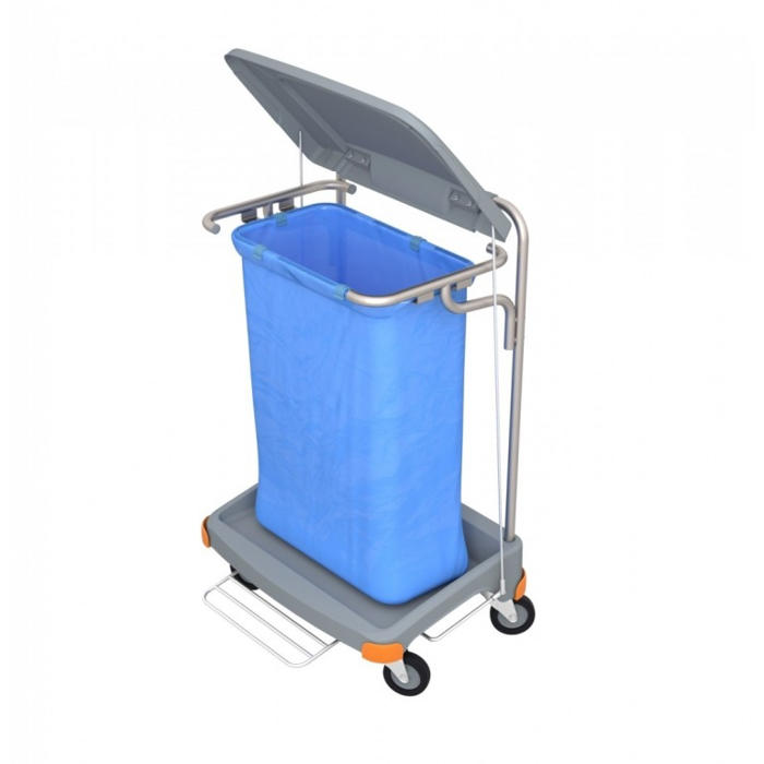 En robust affaldsvogn lavet af metal med et låg, der betjenes med en pedal. Denne affaldsvogn er udstyret med fire drejelige gummihjul, hvilket gør den nem at flytte rundt. Den er designet til at passe til affaldssække på 100 liter.