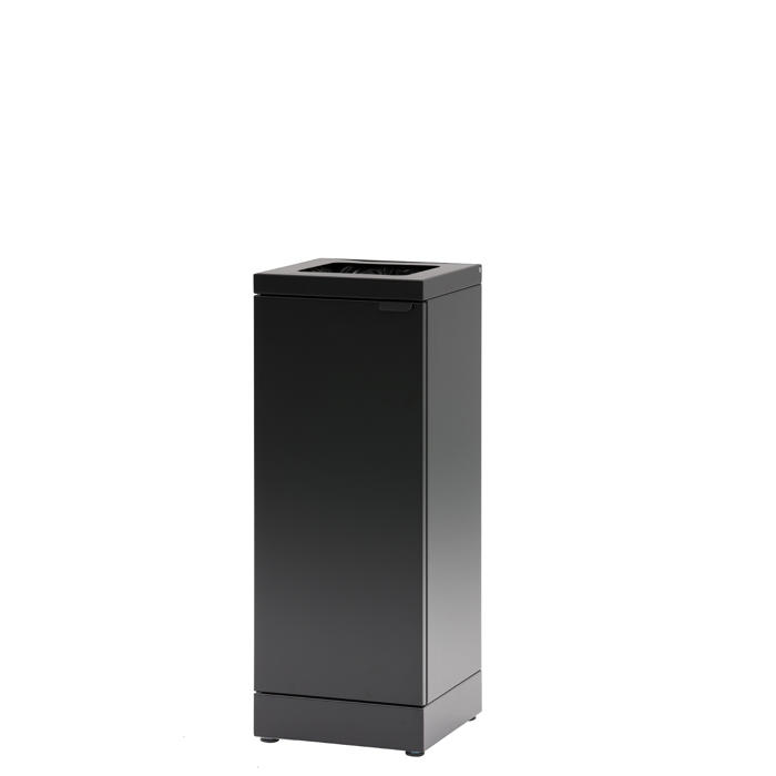 Her er en affaldsbeholder til kildesortering med kvadratisk indkast. Låget har en soft close-funktion, og der er en integreret poseholder. Beholderen er lavet af pulverlakeret stål, har en kapacitet på 45 liter og måler 26,5x26,5x71,5h cm. En praktisk løsning til både kontoret og kantinen.
