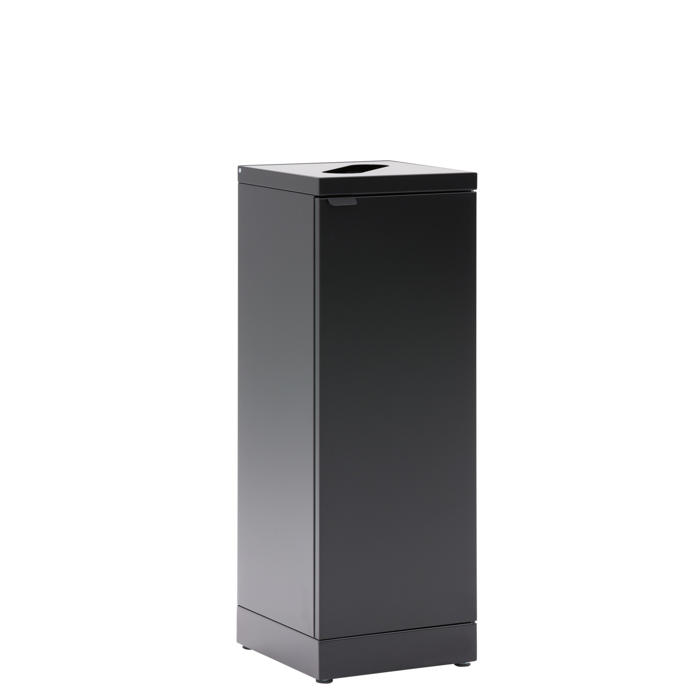 Her er en affaldsbeholder til kildesortering med papirindkast. Låget har en soft close-funktion, og der er en integreret poseholder. Beholderen er lavet af pulverlakeret stål, har en kapacitet på 65 liter og måler 30x30x84,5h cm. En praktisk løsning til kontoret eller kantinen.