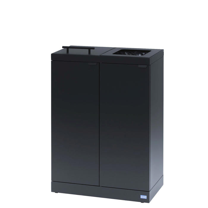 Her er en affaldsstation med to beholdere. Den ene har et kvadratisk indkast, mens den anden har et låg. Begge beholdere er monteret på hjul. Låget har en soft close-funktion, og der er en integreret poseholder. Beholderne er lavet af pulverlakeret stål og har en kapacitet på 2 x 65 liter. Målene er 60x30x84,5h cm. En praktisk løsning til både kontor og kantine.