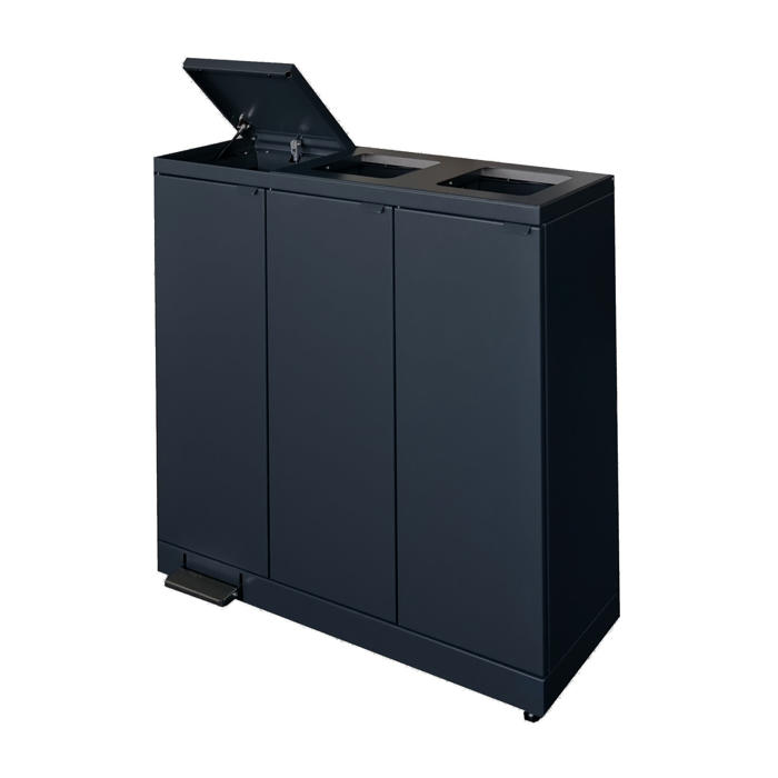 Denne affaldsstation er udstyret med tre beholdere: to med kvadratisk indkast og en med låg. Modellen har en pedal til at åbne låget, hvilket er praktisk til f.eks. madaffald. Låget har en soft close-funktion, og der er en integreret poseholder. Beholderen er lavet af pulverlakeret stål og har en kapacitet på 3 x 65 liter. Dimensionerne er 87x30x84,5 cm, og den leveres med justerbare fødder. En stilfuld løsning til både kontor og kantine. Med flere af disse affaldsstationer kan du nemt opbygge en komplet kildesorteringsstation.