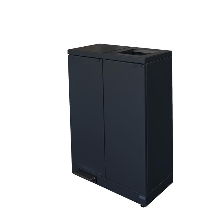 Her er en affaldsstation med to beholdere. Den ene har et kvadratisk indkast, mens den anden har et låg, der kan åbnes med en fodpedal. Stationen er udstyret med hjul, og låget lukker blødt. Der er også en integreret poseholder. Beholderen er lavet af pulverlakeret stål og har en kapacitet på 2 x 65 liter. Den måler 60x30x84,5h cm. En praktisk løsning til både kontor og kantine.