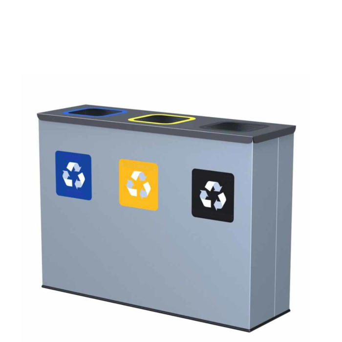 Denne affaldsstation er udstyret med tre kvadratiske indkast og inkluderer tre inderspande, hver med en kapacitet på 30 liter. Låget i toppen gør det nemt at tømme sækkene.