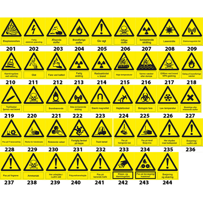 Dette advarselsskilt i A4-størrelse er ideelt til at advare om potentielle farer som glatte gulve eller truckkørsel. Skiltet er lavet af 1,2 mm tykt gult kunststof og har sort tekst og symboler, der gør det let at læse og forstå. Husk at angive nummeret på det ønskede skilt under bemærkninger ved bestilling.
