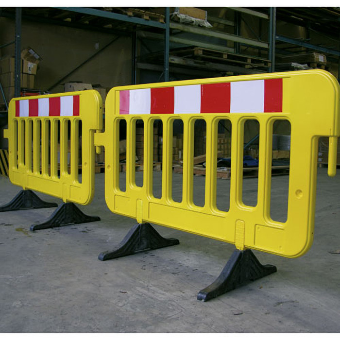 Dette gule afspærringsgitter er udstyret med røde reflekser, hvilket gør det synligt om natten. Det er designet til at opfylde de gældende krav til afspærring ved vejarbejde. Gitteret er let at stable og flytte, hvilket gør det praktisk i brug.