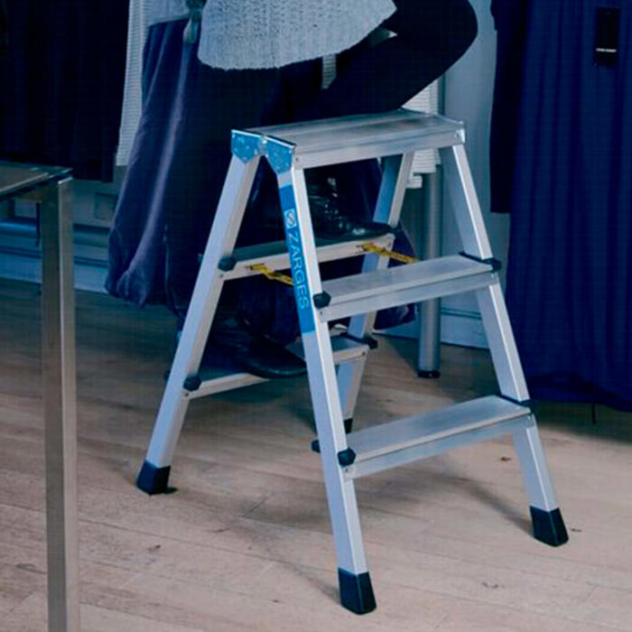 Denne arbejdsbuk er lavet af aluminium og har en stor platform, der giver dig en stabil arbejdsflade. Trinene er 85 mm dybe og ergonomisk designet, så du kan stå sikkert og komfortabelt på begge sider.
