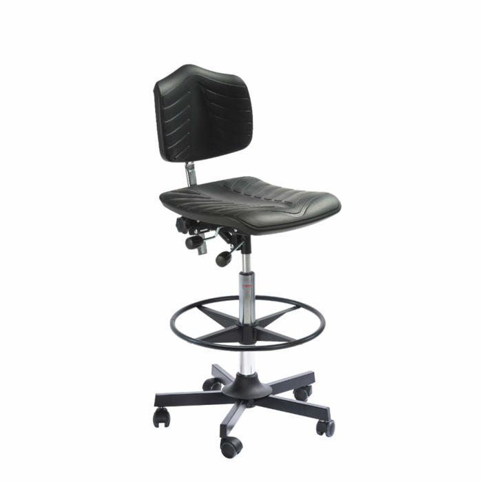 Holdbar arbejdsstol designet til krævende miljøer. Udstyret med Euromatic mekanisme, der giver mulighed for trinløs justering af både sæde- og ryglænsvinkel. Sædet og ryglænet er fremstillet af super-blødt, slidstærkt og let rengørligt sort polyurethan-skum. Stolen har en solid fodkryds og fodring i sort stål samt hjul med belastningsbremse. Justerbar siddehøjde fra 71 til 97 cm.