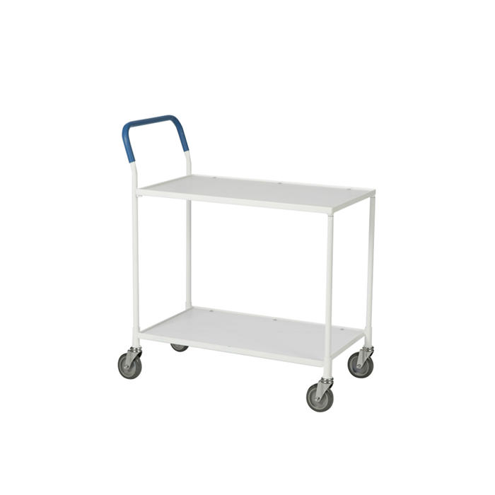 Denne bordvogn er udstyret med to hylder og et højt håndtag, hvilket gør den praktisk til mange formål. Den er lavet af en robust, lakeret stålkonstruktion og har en 10 mm limet laminattop. Afstanden mellem hylderne er 51 cm, og højden til den øverste hylde er 72 cm. Vognen har fire drejelige hjul med en diameter på 10 cm, hvilket gør den nem at flytte rundt. Den kan bære op til 150 kg og leveres usamlet.