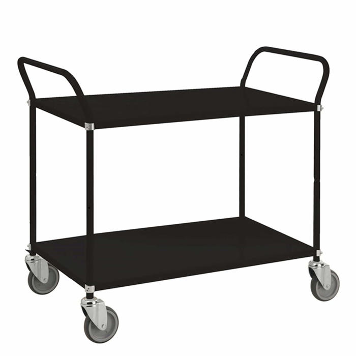 Robust bordvogn med to hylder, fremstillet i en solid stålkonstruktion. Vognen er pulverlakeret i sort og udstyret med fire drejelige hjul med en diameter på 12,5 cm. Den kan bære op til 250 kg. Dimensionerne er 48x108x94h cm. Leveres i adskilte dele.