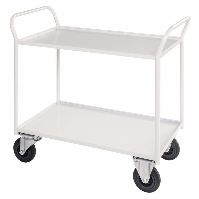 Robust bordvogn med to hylder, fremstillet i en solid svejset stålkonstruktion, der kan bære op til 400 kg. Hylderne er designet med kanter for ekstra sikkerhed. Vognen er hvidlakeret og udstyret med gummihjul for nem mobilitet. Leveres fuldt samlet.
