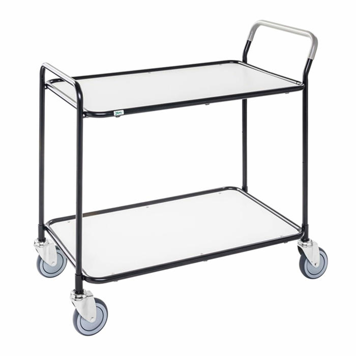 De afrundede hyldekanter i sort stål giver et blødere udseende. Denne vogn passer godt ind på kontorer, restauranter og andre steder. Den er robust og kan klare en høj belastning.