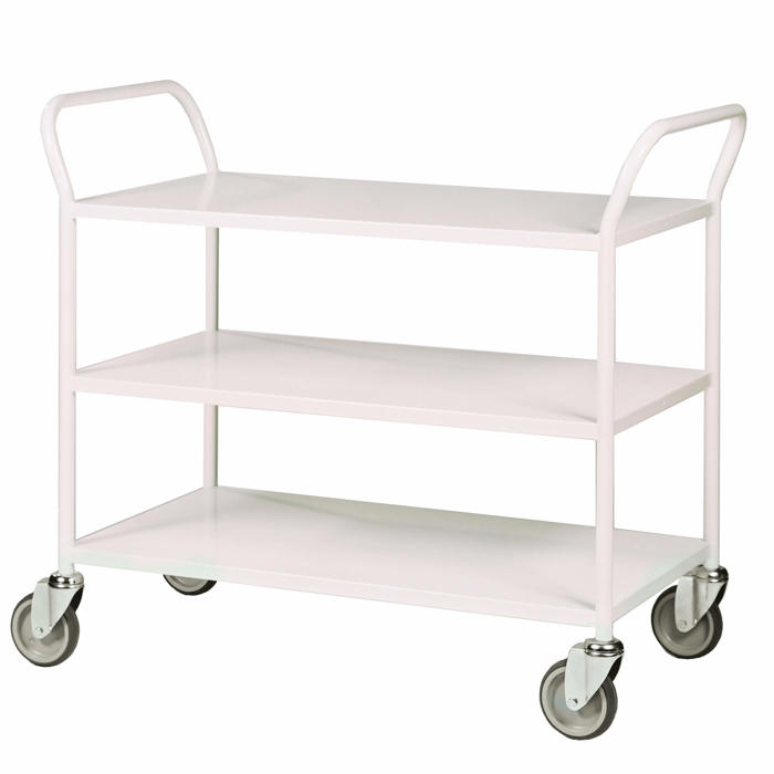 Denne bordvogn er lavet af en robust stålkonstruktion og har tre hylder. Den er udstyret med håndtag i begge ender, hvilket gør den nem at manøvrere. Hylderne kan monteres enten med kanten opad eller nedad, alt efter hvad der passer bedst til dine behov. Den samlede belastning for vognen er 250 kg, og den leveres usamlet.
