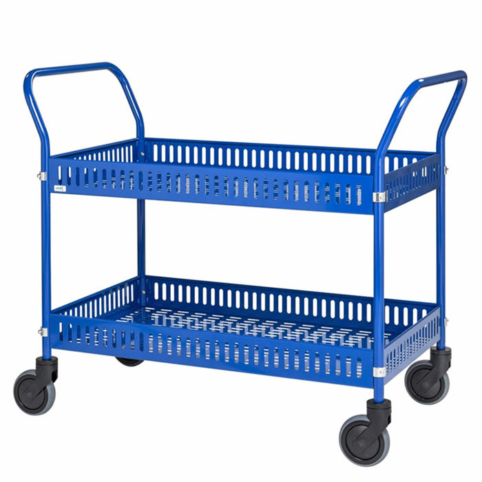 Dette rullebord i plademetal er designet med en høj kant og har to hylder. Det smarte design gør vognen let, selvom den har en stor størrelse. Den er nem at holde ren og er pulverlakeret i blå farve. Rullebordet har en kapacitet på 250 kg og er lavet med perforeret plade. Bemærk, at det leveres usamlet.