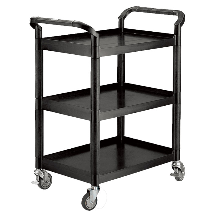 Sort rullebord i superplast med tre hylder. De sorte aluminiumssøjler giver ekstra stabilitet. Bordvognen måler 85 x 48 x 100h cm og kan bære op til 250 kg. Udstyret med fire drejelige hjul, hvoraf to har bremser. Håndtag er placeret i begge ender for nem manøvrering. Leveres usamlet.