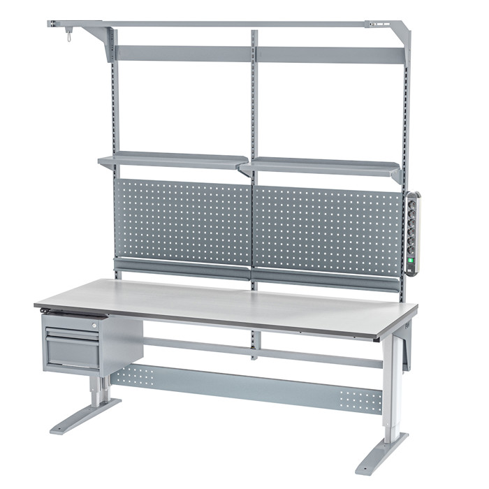 ESD arbejds og montagebord med el hæve/sænke funktion. Bordpladen måler 80 x 200 cm, og er 2,4 cm tyk. Bordet er udstyret med hulplade for ophængning af værktøj. Bordet kan justeres i højden fra 70 cm til 115 cm. Bordet leveres komplet med paneler og værktøjstavler, samt overbygning til lysindfatning. Bordet er malet med halvledende epoxipolysterpulver. Farven opfylder kravene i SP 2472