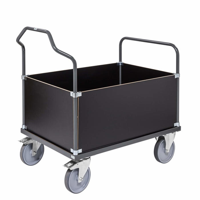 Ergo ladvogn med robust MDF-laminat træplade. Stellet er fremstillet af gråtlakeret stål. Vognen er udstyret med to faste og to drejelige hjul, der har en diameter på 200 mm og er letløbende med gummibelægning. Den har en kapacitet på 500 kg og en håndtagshøjde på 106 cm.