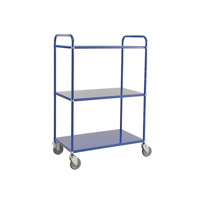 Robust etagevogn fremstillet i solid stålkonstruktion. Udstyret med tre hylder, hvor afstanden mellem hylderne er 53 cm. Tophyldens højde er 134 cm. Vognen kan bære en samlet vægt på 250 kg, med en maksimal belastning på 80 kg pr. hylde. Den er monteret med fire drejelige gummihjul for nem manøvrering.
