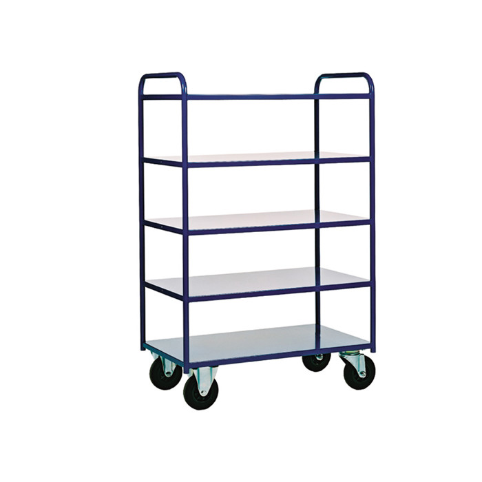 Denne etagevogn er designet med 5 hylder og en robust stålkonstruktion, der kan bære op til 400 kg. Hylderne har kanter, og vognen er blålakeret. Du kan også få den i hvidlakeret eller elforzinket udgave.