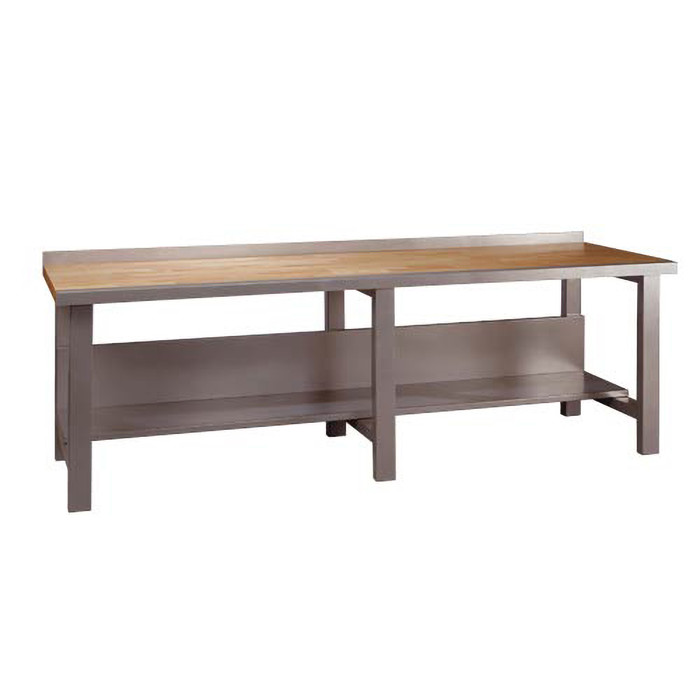 Den integrerede bagplade gør det nemt at montere værktøj og tilbehør, så du altid har det nødvendige udstyr inden for rækkevidde. Under bordpladen findes en gennemgående stålhylde, der giver praktisk opbevaringsplads til materialer og redskaber.