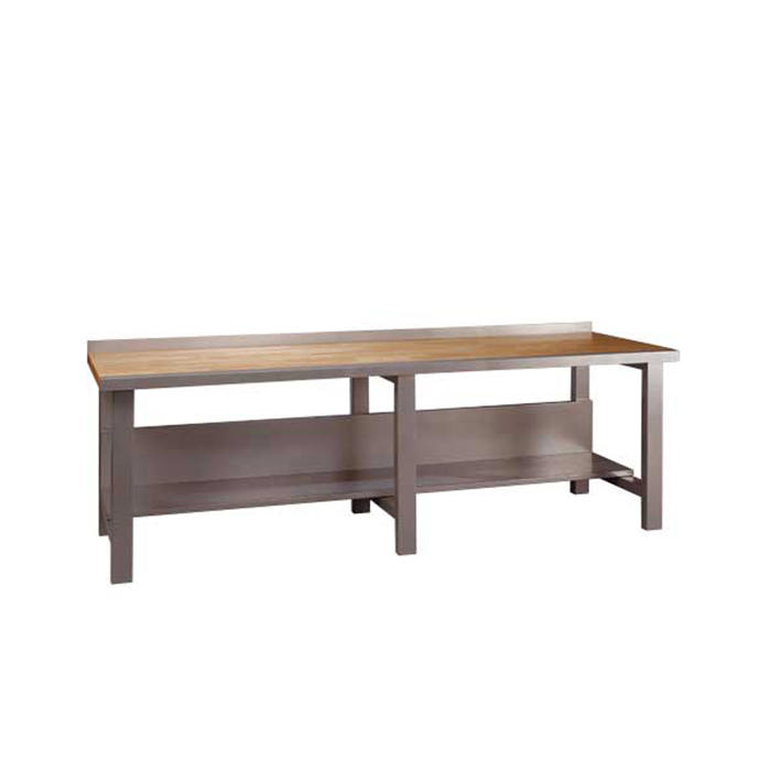 Den integrerede bagplade giver mulighed for montering af værktøj og tilbehør, så du altid har det nødvendige udstyr inden for rækkevidde. Under bordpladen findes en gennemgående stålhylde, der giver praktisk opbevaringsplads til materialer og redskaber.