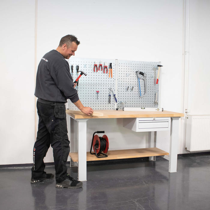 Filebænken inkluderer en svejset skuffe, der glider på kraftige skinner og er udstyret med en lås. Der medfølger også et sæt med 50 værktøjskroge, som kan hænges på den medfølgende tavle, der måler 80x150 cm. Bemærk, at værktøj ikke medfølger.