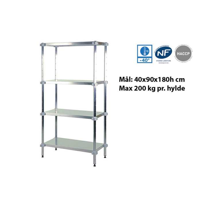 Inox Standard rustfri fødevarereol er ideel til opbevaring i kølerum og frostrum, da den kan tåle temperaturer ned til -40 grader. Reolen er godkendt i henhold til HACCP og NF-standarder, hvilket gør den velegnet til fødevareopbevaring. Med en højde på 180 cm, hyldedybde på 40 cm og hyldebredde på 90 cm, tilbyder denne reol en robust og fleksibel opbevaringsløsning.