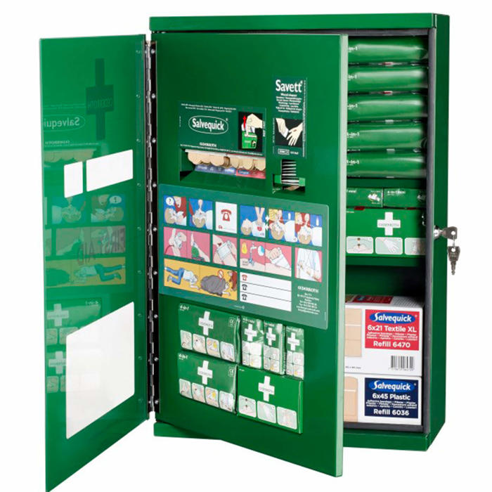 Dette førstehjælpsskab fra Cederroth er ideelt til arbejdspladser, hvor der ofte er snavs, støv og fugt. Skabet er designet til områder, der kræver omfattende førstehjælpsudstyr. Det er lavet af metal og har to døre, som opdeler skabet i to sektioner. Den ydre sektion fungerer som et førstehjælpspanel med nem adgang til førstehjælpsprodukter, beskyttet af en Plexiglas-dør mod støv og fugt. Den indre sektion har en låsbar plads til opbevaring af ekstra påfyldningsprodukter.