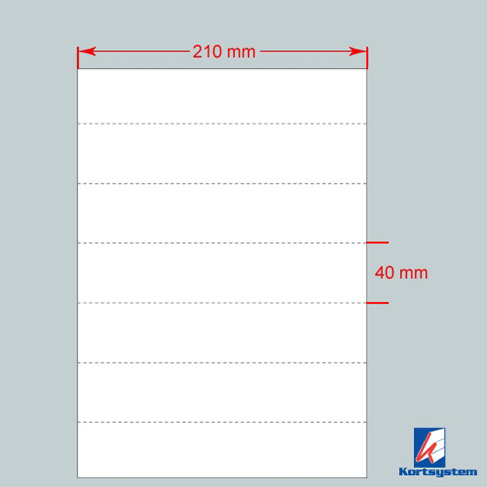 Dette etiketkarton er designet til laserprint og kommer i A4-størrelse med perforeringer. Hver ark måler 210x40 mm og indeholder 7 etiketkartoner. De er hvide og kan printes og indsættes i etiketholdere. Bemærk, at mindstekøbet er 10 ark.
