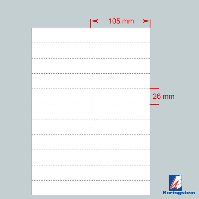 Dette etiketkarton er designet til laserprint og kommer i A4-størrelse. Hver ark indeholder 22 etiketter, som måler 105x26 mm. De hvide etiketter kan nemt printes og indsættes i etiketholdere, hvilket gør dem praktiske til mange formål. Bemærk, at mindstekøbet er 10 ark.