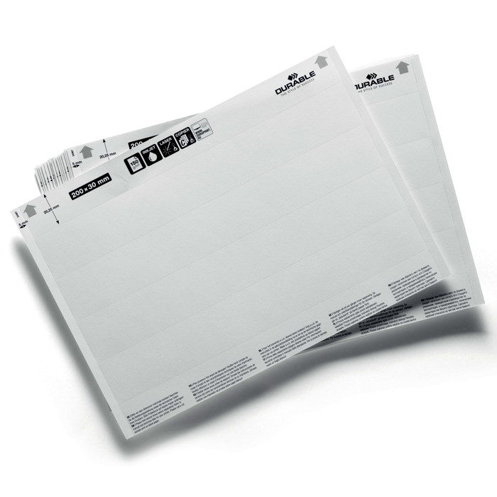 Med label refill printark kan du nemt og præcist opmærke dine DURABLE produkter. Disse indstik ark i A5-format er designet til at passe til SCANFIX®, c-profiler og LABELFIX®. De mikroperforerede indstiksetiketter er velegnede til både printere og kopimaskiner, hvilket gør dem ideelle til professionel opmærkning i produktion og lager.