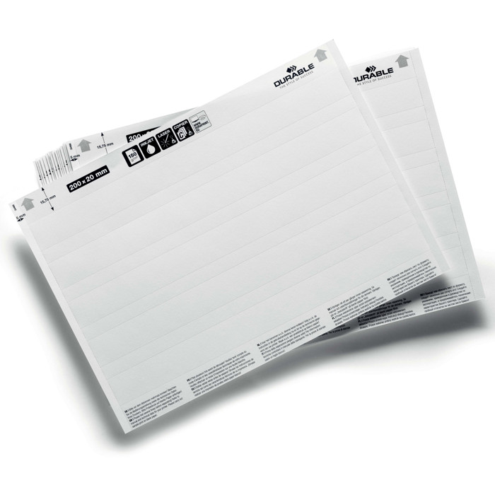 Label refill printark er ideelle til præcis opmærkning af DURABLE produkter. Disse indstik ark i A5-format passer perfekt til SCANFIX®, c-profiler og LABELFIX®. De mikroperforerede indstiksetiketter er velegnede til både printere og kopimaskiner, hvilket gør dem perfekte til professionel opmærkning i produktion og lager.