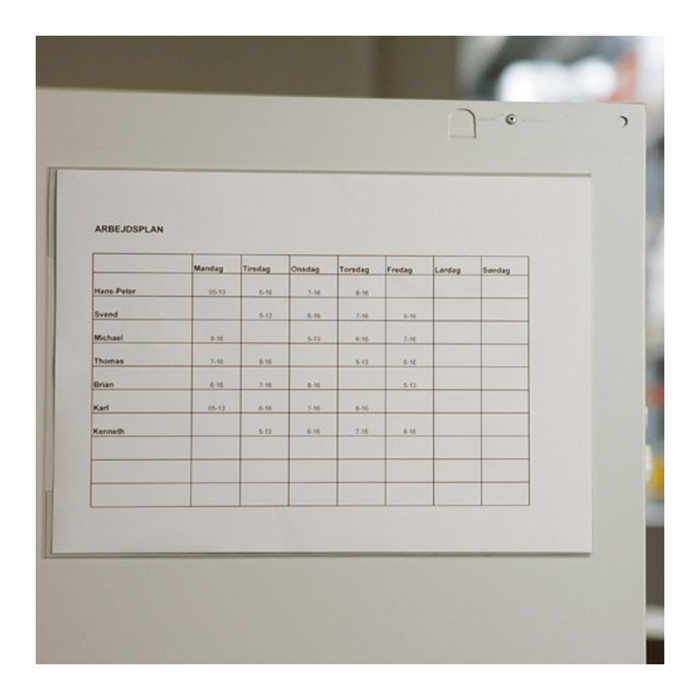 Informationstavlen er lavet til at stå oprejst, hvilket gør den perfekt til kontorer, skoler og andre steder, hvor information skal være let tilgængelig. Den passer til standard A4-papir, så du kan bruge den til alt fra mødeagendaer til opslag.