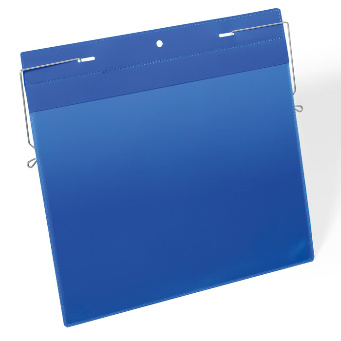 Denne lagerlomme er udstyret med et galvaniseret, bøjelig wirebeslag, der gør det nemt og sikkert at fastgøre den. Bagsiden er blå, og forsiden er et gennemsigtigt vindue lavet af holdbar polypropylen. Den er ideel til brug på containere, pallerammer og paller bokse.