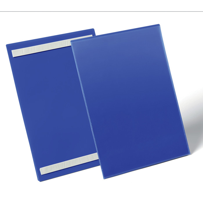 En lagerlomme med blå bagside og selvklæbende strips, der har et gennemsigtigt vindue lavet af holdbar polypropylen. Den kan bruges på forskellige overflader som metal, karton og plast. Lagerlommen er rivefast og velegnet til scannere, hvilket gør det nemt at udskifte indholdet hurtigt. Du kan finde gratis skabeloner til etiketter på www.duraprint.eu.