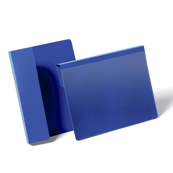 En hængende lagerlomme er ideel til mærkning af paller og kasser. Du kan nemt indsætte den mellem stablede kasser eller folde toppen af lommen og lade den hænge ud over kanten af pallen. Disse slidstærke lagerlommer har en blå bagside og en gennemsigtig front, hvilket gør det nemt at indsætte og udskifte etiketter. De er også velegnede til brug med scannere og er træbestandige. Du kan downloade skabeloner til indstiketiketter på www.duraprint.eu.