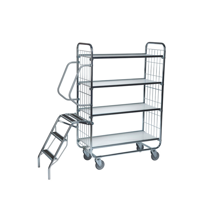 Hyldevognen kommer med fire svingbare hjul, der har en grå gummibane og en diameter på 12,5 cm. Dette gør det nemt at flytte vognen rundt, selv når den er fuldt lastet. De grålakerede håndtag kan justeres i højden, så du kan tilpasse dem efter dine behov.