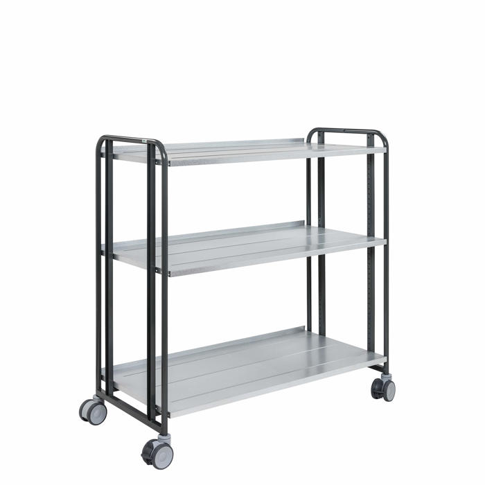 Denne hyldevogn er pulverlakeret og måler 63,8x127,7x130h cm. Den har tre hylder, som kan justeres til at være enten plane eller skrå, alt efter behov. Hyldemålene er 60x122 cm, og den er designet til at passe til Eur-kasser i størrelser som 40x60 cm.