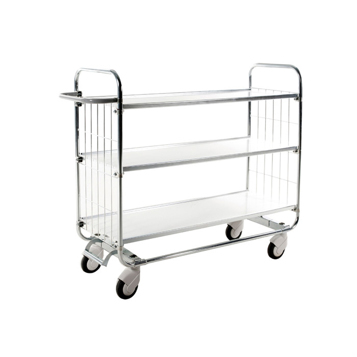 Her har du en fleksibel hyldevogn med tre hylder, som er udstyret med en centralbremse. Vognen måler 140 cm i længden, 47 cm i bredden og 112 cm i højden. Den har elforzinkede gavle og hyldekanter, mens hyldepladerne er lavet af 12 mm laminat og kan justeres i højden. Håndtaget er grålakeret og kan også justeres i højden.