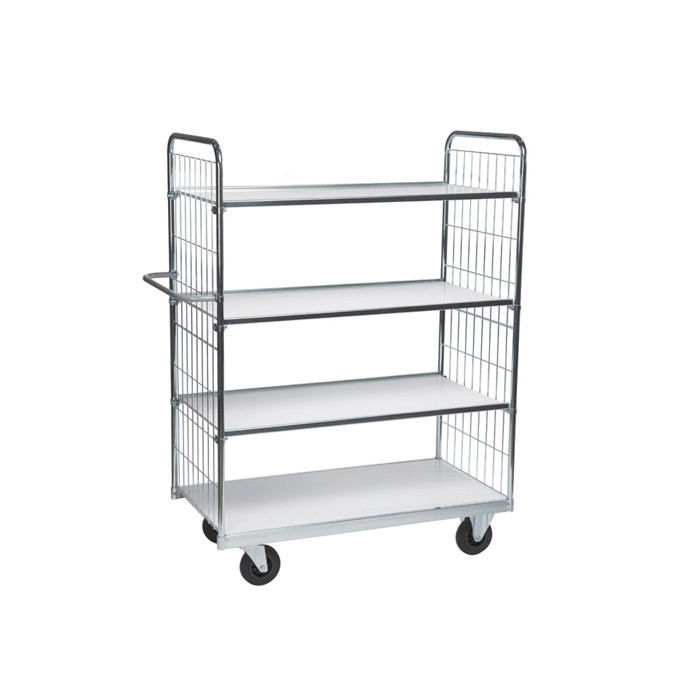 Vognen er udstyret med fire hjul, hvoraf to er faste og to er svingbare, med en diameter på 16 cm. Dette gør det nemt at flytte vognen rundt, selv når den er fuldt lastet. Den robuste konstruktion gør, at vognen kan bære en belastning på op til 300 kg, hvilket gør den velegnet til både lette og tunge opgaver.