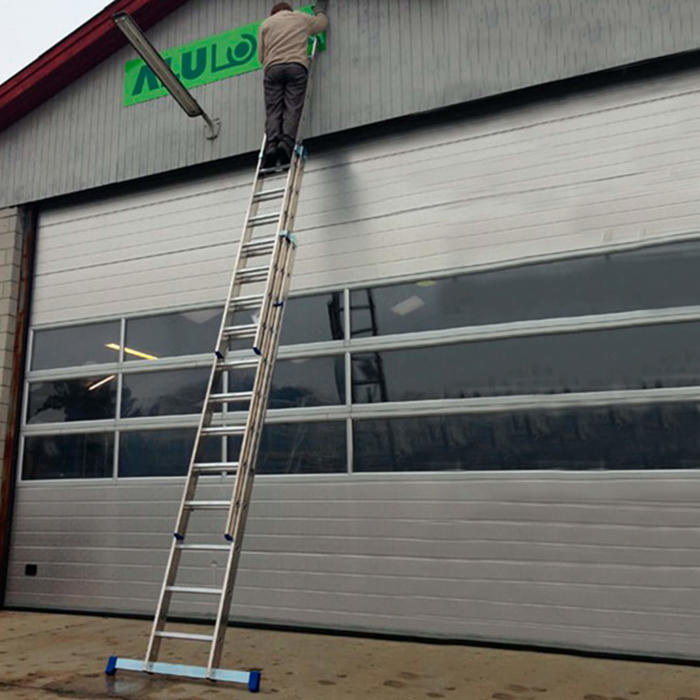 Denne 3-delte kombistige er ideel til både professionelle og private brugere. Med en maksimal højde på 9,50 meter kan den anvendes som både skydestige og wienerstige. Du kan bruge den som en 2-delt eller 3-delt skydestige, eller som en 2-delt wienerstige med det tredje stigeelement som støtte.