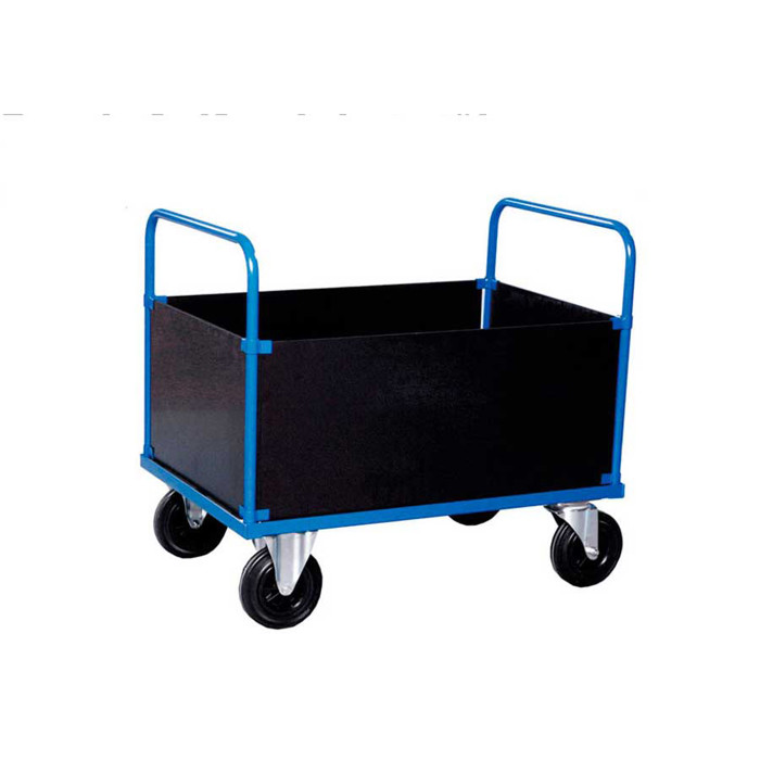 BlueSteel ladvognen er en alsidig løsning til dine transportbehov. Den er designet med en slidstærk træplade i MDF-laminat og et robust stel i blålakeret stål, hvilket gør den både holdbar og pålidelig. Vognen er udstyret med to faste og to drejelige hjul, som er lavet af massiv gummi, hvilket sikrer en jævn og stabil kørsel.