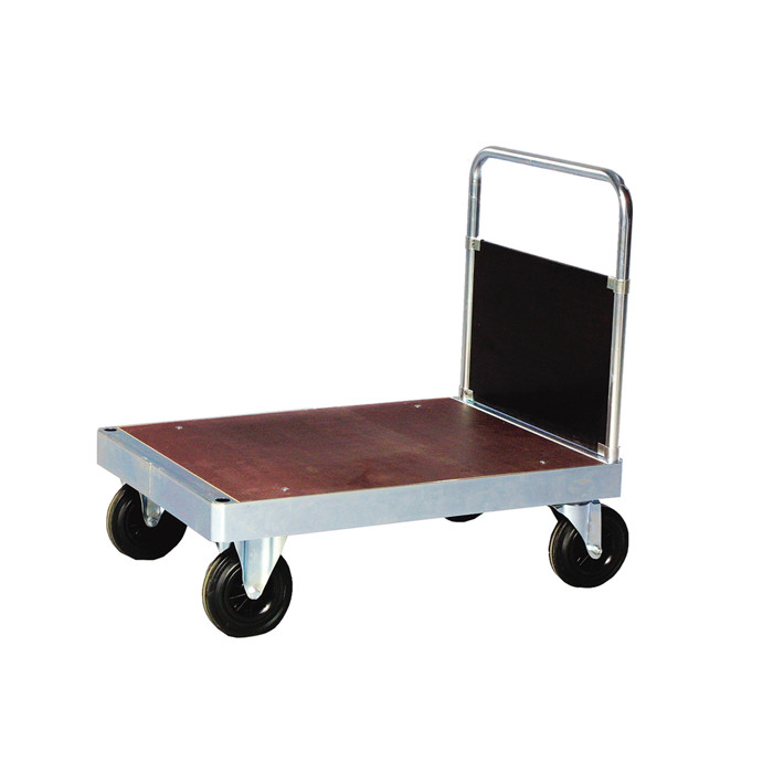 Ladvognen har en træplade lavet af slidstærk MDF-laminat, som giver en solid overflade til dine varer. Stellet er elforzinket, hvilket beskytter mod rust og slid. Vognen er udstyret med to faste og to drejelige hjul, der gør det nemt at manøvrere, selv med tung last.