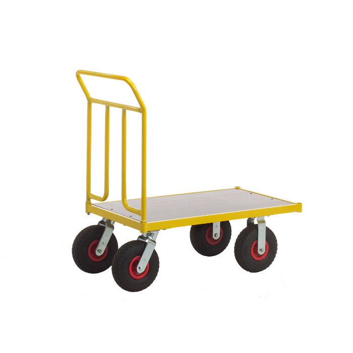 Denne ladvogn er udstyret med luftgummihjul, hvilket gør den nem at manøvrere på forskellige underlag. Den er malet i en iøjnefaldende gul farve, så den er let at få øje på. Stellet er lavet af pulverlakeret stålrør, hvilket giver en robust og holdbar konstruktion. Bunden er lavet af krydsfinér, som giver en stabil overflade til dine varer.