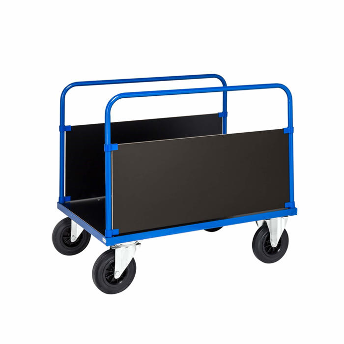 BlueSteel langgavlsvogn er en alsidig løsning til mange forskellige opgaver. Den er udstyret med træplader i slidstærk MDF-laminat og et stel i blålakeret stål, hvilket gør den robust og holdbar. Vognen kommer med to faste og to drejelige hjul, der er lavet af massiv gummi, hvilket sikrer en stabil og jævn kørsel.