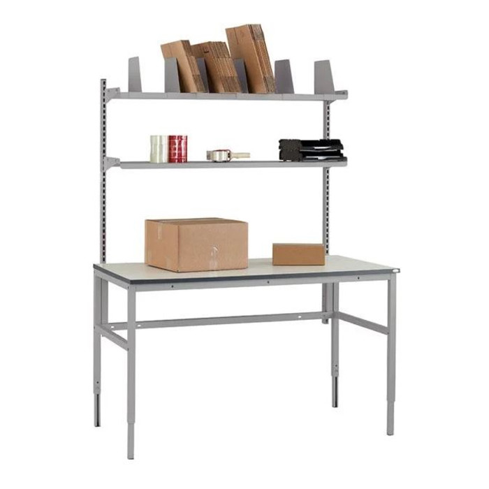 Dette pakkebord er ideelt til forskellige arbejdsopgaver. Bordpladen er lavet af 24 mm gråhvid laminat og er monteret på et justerbart understel, så du kan tilpasse højden efter behov. Pakkebordet kommer med to hylder, hver med en bredde på 135 cm, og inkluderer seks skilleplader, der gør det nemt at organisere dine ting.