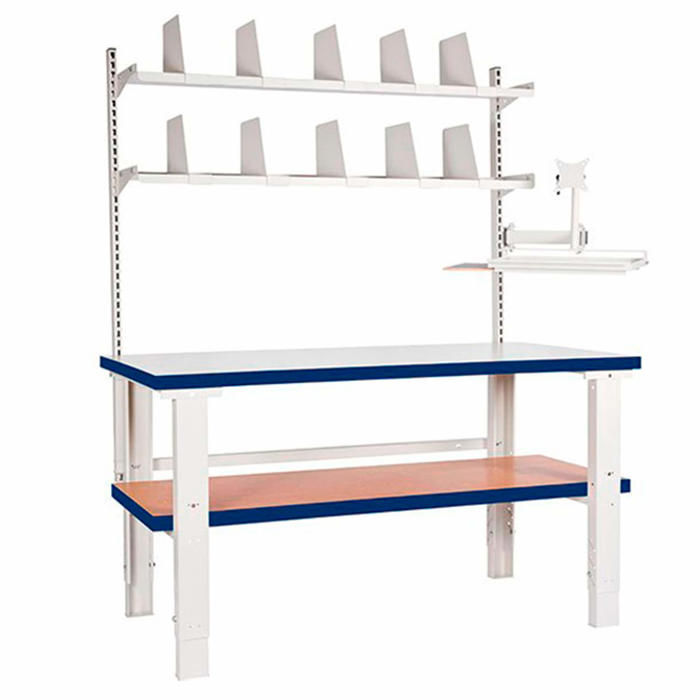 Dette pakkebord er ideelt til dig, der har brug for en robust og fleksibel arbejdsstation. Bordpladen er lavet af 40 mm gråhvid laminat og understøttes af et justerbart understel, så du kan tilpasse højden efter dine behov. Bordet leveres med en skærmholder, der passer til VESA 75/100, samt to hylder på 180 cm i bredden, som inkluderer 10 skilleplader. Derudover får du en underhylde i samme gråhvide laminat.