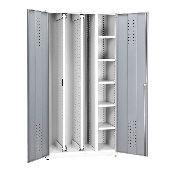 Dette værktøjsskab er designet til at holde styr på dit værktøj med to store udtrækspaneler, der gør det nemt at hænge værktøjet op. Skabet har en størrelse på 54 x 102 x 200 cm og kan klare en belastning på op til 500 kg. I højre side af skabet finder du fem hylder, der giver ekstra plads til opbevaring. For at sikre, at skabet står stabilt, selv på ujævne gulve, er det udstyret med fire justerbare skruer i bunden. Udtrækspanelerne har standard ophængshuller og dækker et areal på 1,5 m2. Skabet kan låses for at beskytte dit værktøj.