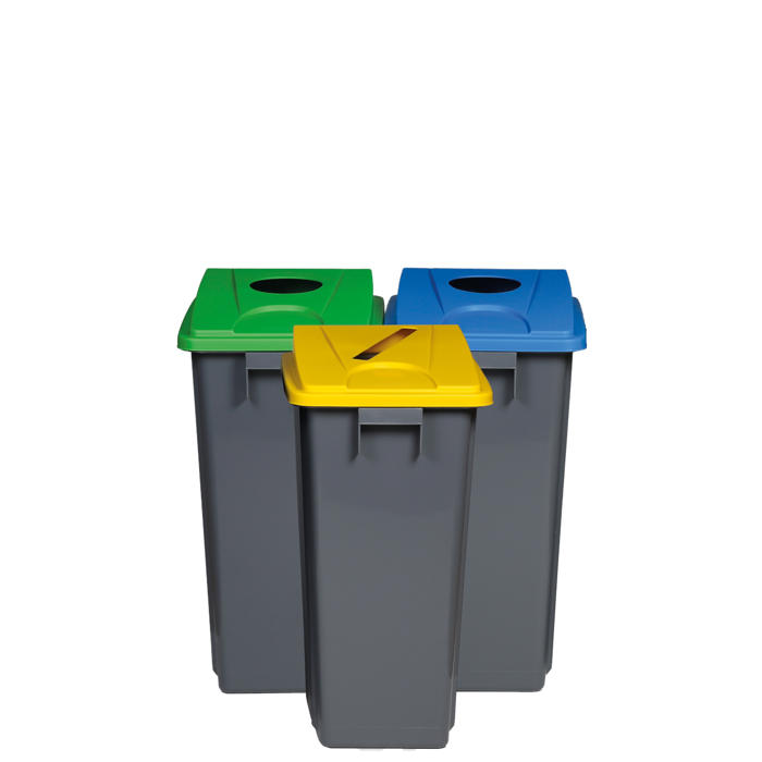 De medfølgende låg kommer i farverne grøn, blå og gul. Lågene har indkast til papir og to med runde huller, hvilket gør det nemt at sortere affaldet korrekt.