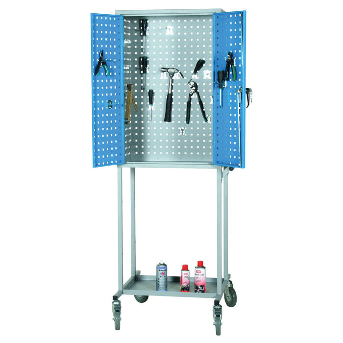 Denne værkstedsvogn er designet til at være mobil og praktisk. Den har et skab med blå låger og hulplader både i skabet og på lågerne, hvilket gør det nemt at hænge værktøj op. Understellet er lavet af grå firkantrør og har en hylde i bunden for ekstra opbevaring. Vognen er udstyret med fire drejelige gummihjul (125x27), som gør det let at flytte den rundt. Der medfølger et mix af 20 kroge, og der er mulighed for at indsætte en skuffesektion. Bemærk, at værktøj ikke medfølger.
