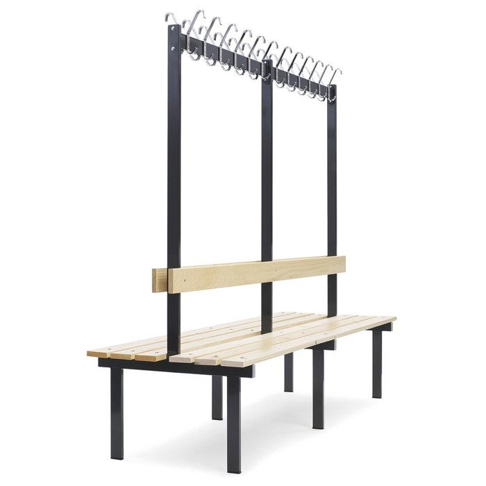 Dobbeltbænk med knagerække,Udstyret med 24 kroge i forniklet stål. 200 cm bred. Sædet er fremstillet af lakeret fyrretræ, mens stellet er sort og lavet af svejste firkantrør, der er pulverlakeret (RAL 9002).
